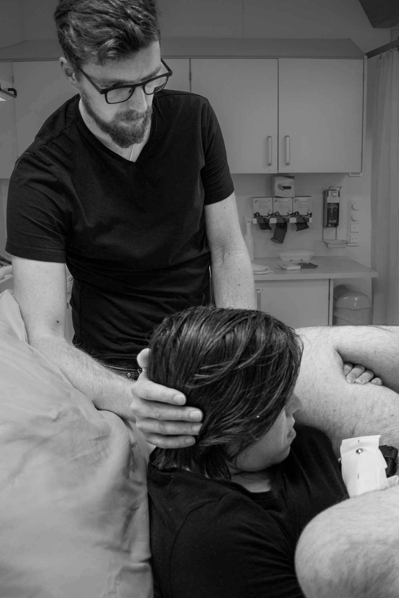 Ik weet niet meer of hij huilde, maar zijn warmte op mijn blote borst voel ik nog steeds. Dankzij onze fotograaf-zonder-naam zie ik mijn kracht, de liefde in mijn ogen terwijl hij op mij ligt, maar vooral ook wat er met hem gebeurde terwijl ik gehecht werd en moest afwachten hoe het met hem ging terwijl hij met zijn vader en een heel team in het controle kamertje werd verzorgd.