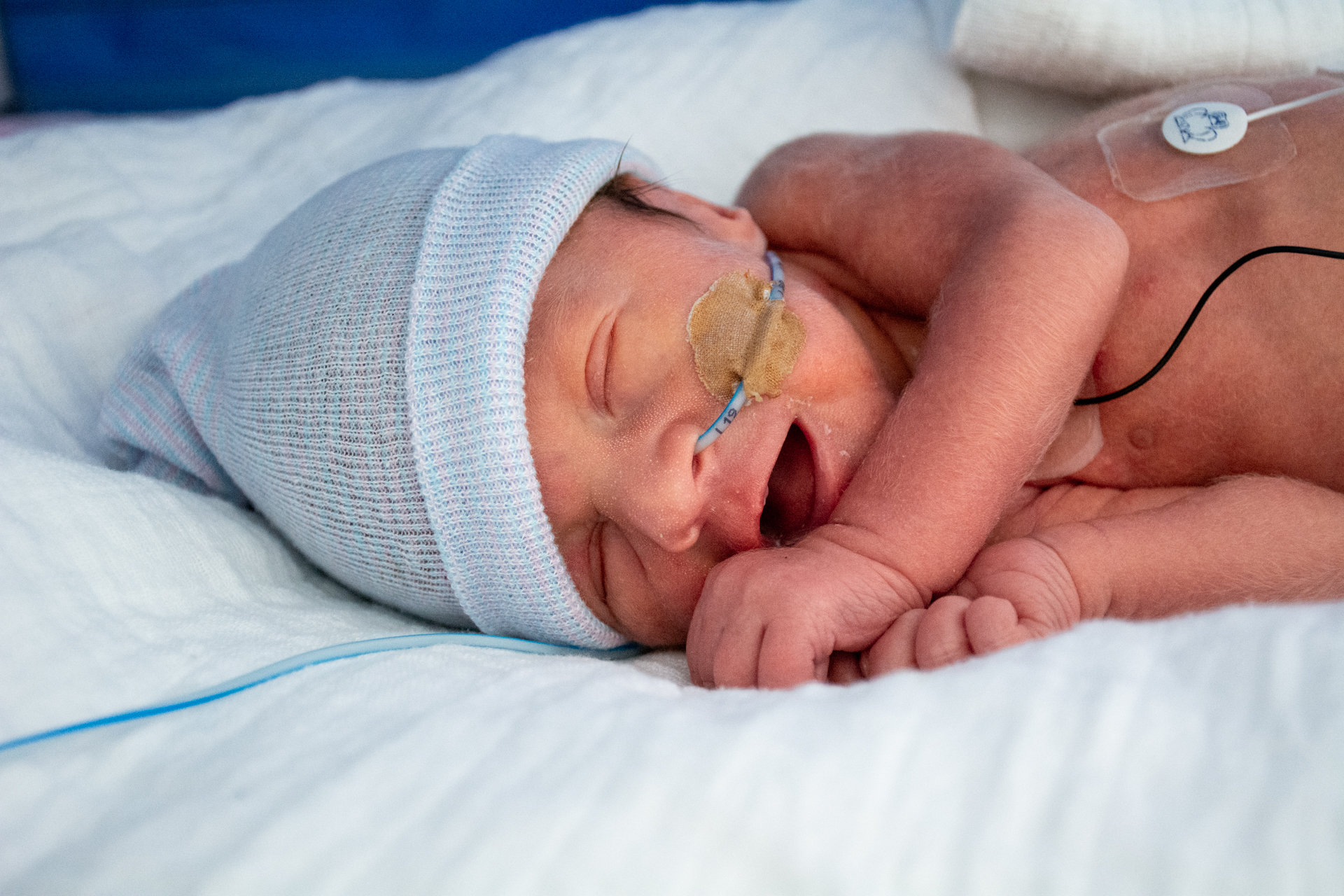 ‘Hij ademt goed uit zichzelf dus hij mag even bij je liggen’, hoor ik ze zeggen.
